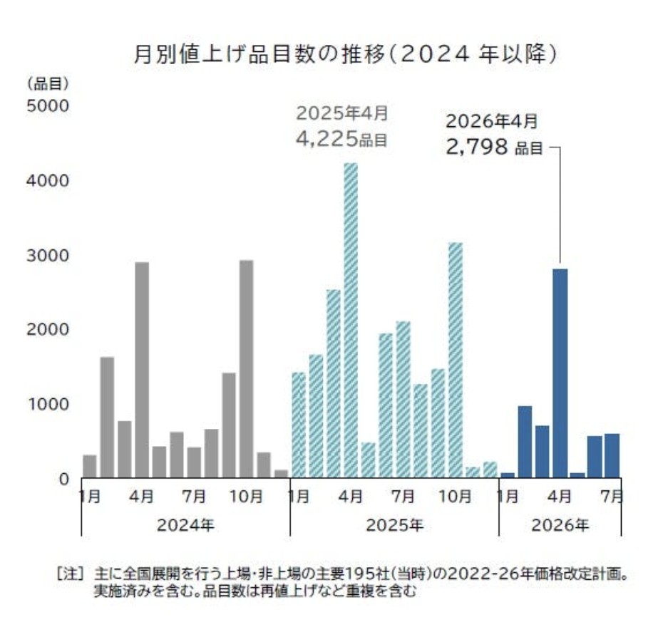 4月に入り、スーパーの棚で「価格改定」のシールを目にする機会が増えていないでしょうか。今月だけで主要食品メーカー195社が2,798品目を値上げしました。マヨネーズやドレッシング、食用油(参考:食品新聞)、即席麺、缶詰と、食卓に並ぶ品々が軒並み値上がりしています。企業が値上げの理由として挙げるのは、原材料費、物流費、エネルギーコストの三重苦です。生産から店頭まで、あらゆる工程でのコスト増が価格に押し出されてきた格好です。(ロイター)